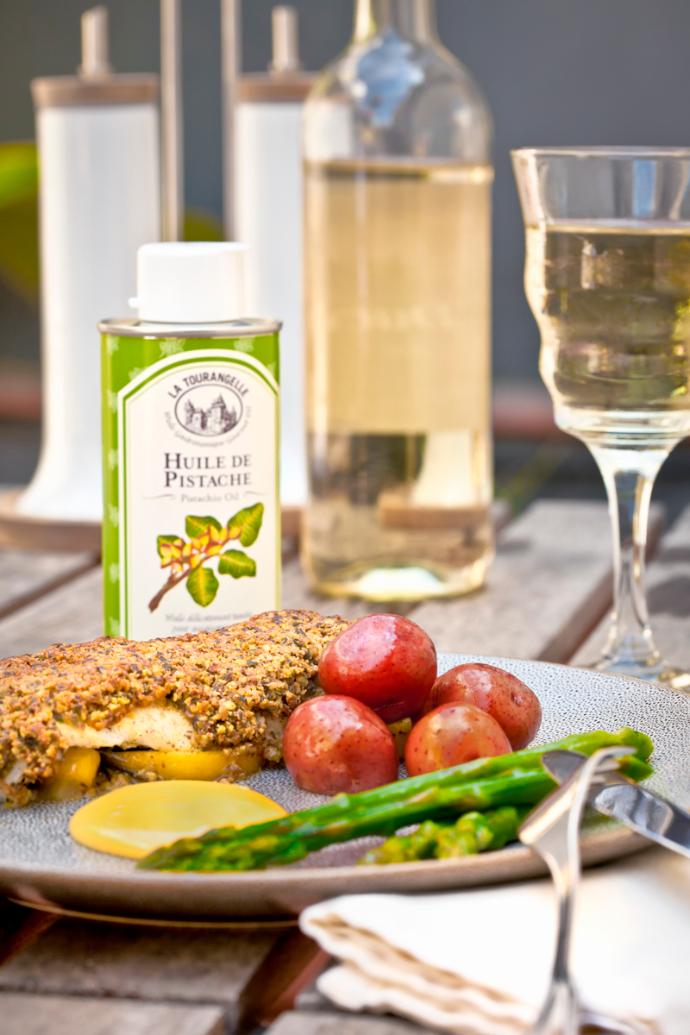 開心果油是一種美味且易於使用的油。在沙拉,開心果油混合香醋或紅酒醋是非常適合的,可以創造出一個簡單但可口的醬汁。也可以嘗試用蒿白醋。使用在烤魚或肉也是非常美味,當完成牛肉布吉尼翁或肉類佳餚時,輕拍開心果油。完美的觸感不僅提高美味,也幫助消化。您也可嘗試使用於奶酪通心粉。請盡情使用開心果油於蛋糕和焙烤食品,特別是帶有蘋果或梨的烘焙中。
