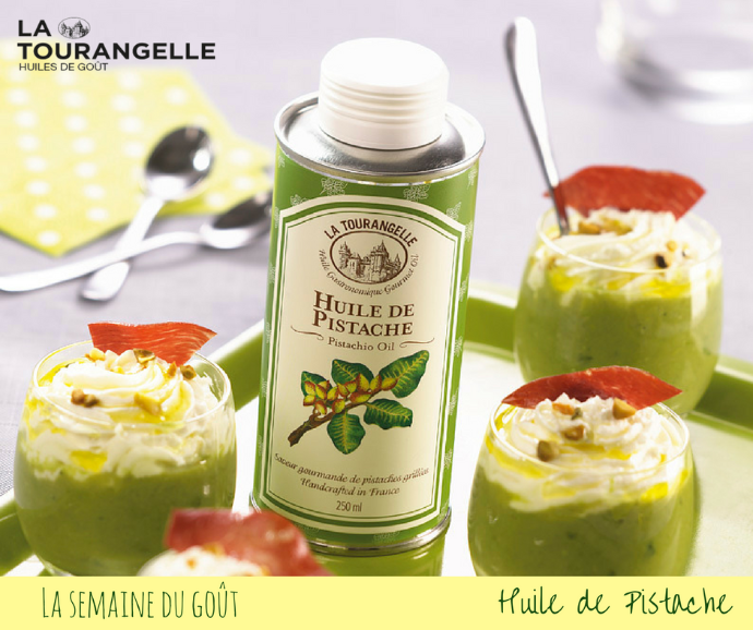 本款開心果油嚴格遵照法國150年傳統方法手工煉製。堅果收成後,經過洗淨、排序、太陽曬乾幾天後,進一步乾燥保存,而後將開心果仁舖在鑄鐵壺中慢慢烤到完美。最後壓榨取油然後過濾、裝瓶。該油具有濃郁的開心果口味和翡翠綠的顏色,為您的沙拉醬、通心粉、烤肉或魚、烤糕點等增添豐富的開心果口味。用來沾麵包食用更是完美。
